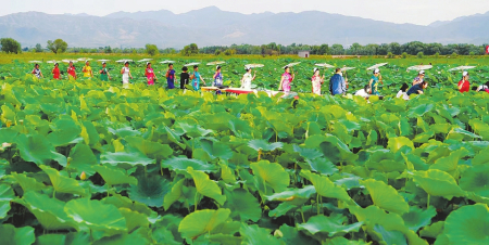 7月,正是荷花盛開的好時節(jié),在定襄縣馬城滹沱人家的“十里荷塘”賞荷花、聞荷香、攝影拍照、吟詩歌唱……既可以欣賞“接天蓮葉無窮碧,映日荷花別樣紅”的魅力景色,還可以享受“四面垂楊十里荷,問云何處最花多”的閑適生活。