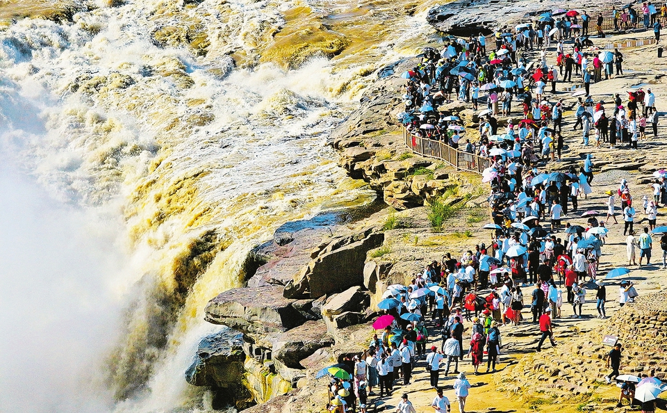 8月20日,游客在吉縣黃河壺口瀑布游覽觀(guān)瀑。近期,黃河壺口瀑布水量增大,形成綿延200余米的特大瀑布群景觀(guān),氣勢(shì)磅礴,吸引了眾多游客前來(lái)感受瀑布和黃河的雄渾之美。