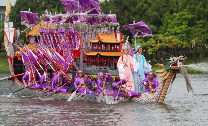 新華社上海6月10日電(記者陳愛平、許曉青)隨著立竿、出龍、點睛、接龍、送標、旺盆等儀式完成,68歲的張亭源老人身著金黃色底、繡有青龍圖案的衣裳,健步登上五彩龍船。平底、昂首、翹尾的龍船在上海寶山美蘭湖面靈活行駛、快速轉(zhuǎn)彎,隊員們齊聲呼號,戲曲演員立于船頭,彩旗在風中飄揚,引得現(xiàn)場觀眾連連叫好。