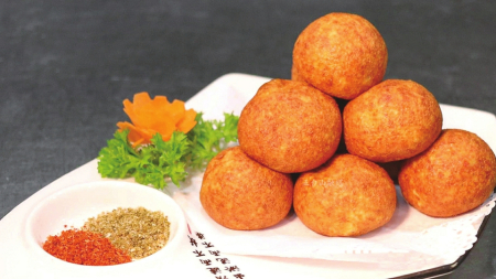 豆腐丸子精選五臺山鹵水豆腐,擠出多余水分,壓成細(xì)膩豆腐碎,加入佐料攪拌,揉成圓潤緊實(shí)的丸子,蒸制后在麥芽糖水中定型再開炸,外衣漸鍍“金甲”,內(nèi)里卻保持著豆腐的柔嫩本味。