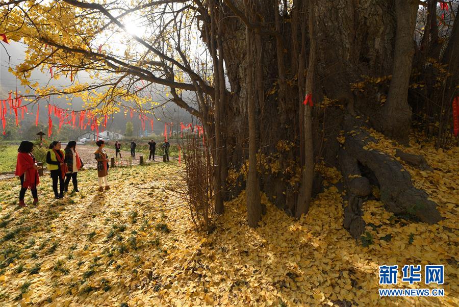 11月19日,游客在留壩縣玉皇廟鎮(zhèn)參觀千年銀杏樹(shù)。初冬時(shí)節(jié),在秦嶺深處的陜西省留壩縣玉皇廟鎮(zhèn)石窯壩村,一棵千年古銀杏樹(shù)的落葉宛如金色地毯,甚為壯觀。據(jù)當(dāng)?shù)亓謽I(yè)部門介紹,該樹(shù)胸徑為4.45米,現(xiàn)有高度29米。新華社記者 陶明 攝