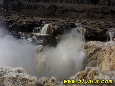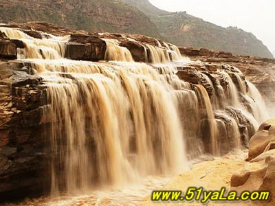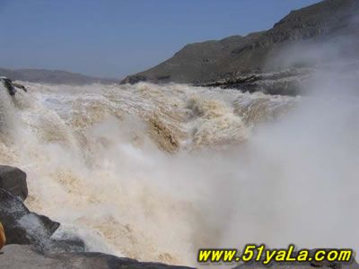 壺口瀑布位于吉縣城西45公里、距臨汾市165公里處的晉陜峽谷黃河河床中,為世界上最大的黃色瀑布,因其氣勢雄渾而享譽中外。此地兩岸夾山,河底石巖上沖刷成一巨溝,寬達30米,深約50米,滾滾黃水奔流至此,倒懸傾注,若奔馬直入河溝,波浪翻滾,驚濤怒吼,震聲數里可聞。其形如巨壺沸騰,故名。黃河浪濤激起一團團霧煙云隨著水霧的升高,煙云由黃變灰、由灰變藍,景色奇麗,有“水底生煙”之說。壺口瀑布不僅有“水底冒煙”,“彩橋通天”奇景,更有“旱地行船”之說。上游船只到此,必須離水登陸,經人抬或車運繞過壺口(即所謂“旱地行船”)方可入水續(xù)航,千百年來,概莫能變。
