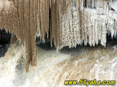 由于四季氣候和水量的差異,壺口景色也時有所變。壺口的春秋兩季,景象也甚為奇特,有氣為虹,橫浮水上,形成了“岸旁無虹掛長雨”的景觀。春回大地的時候,漫山遍野的山桃花盛開,黃河冰岸消融,水量適度平穩(wěn),主瀑、副瀑連成一片,看主瀑云霧迷蒙,望副瀑萬壑千流,觀“龍槽”如巨龍掀浪,稱為“三月桃花汛”;秋季9-11月份雨季剛過去時,河邊眾多山泉小溪,匯集大量清流,陣陣秋風吹過,常有彩虹出現,叫做“壺口秋風”。明陳維藩《壺口秋風》詩有“秋風卷起千層浪,晚日迎來萬丈紅”句,可謂真實寫照。這兩個時期,水大而穩(wěn),瀑布寬度可達千米左右。主瀑難以接近,但遠遠望去,煙波浩淼,威武雄壯。大浪卷著水泡,奔騰咆哮,以翻江倒海之勢,飛流而下。壺口的冬日,又是一種奇觀:壺口兩側,冰簾垂掛,晶瑩剔透,格外誘人,農歷小雪,大雪前后,上游漂流下來的大冰塊,落入壺口平緩處,冰塊相交,冰峰凍結,冰橋天然合成,人履冰橋,如走坦途,人們稱為“壺口叉橋”。在天橋村附近,積冰成橋,冰橋下激流滾滾,濤聲大作,人們稱之為“天橋”。