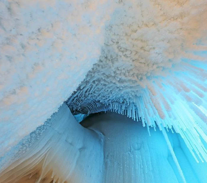 第二天一早,閆鵬和他的朋友全副武裝再次來到了這里,決心對這個(gè)洞探個(gè)究竟。他們拉了一條繩子進(jìn)入洞中,里面黑咕隆咚,腳底滑得根本沒有腳蹬的地方。后來到了一個(gè)稍微開闊的地方,站穩(wěn)腳之后,拿火把四周一看,眼前豁然開朗。他們仿佛置身于一座晶瑩的宮殿,四處都是冰的世界:冰柱、冰錐、冰瀑、冰筍、冰花。