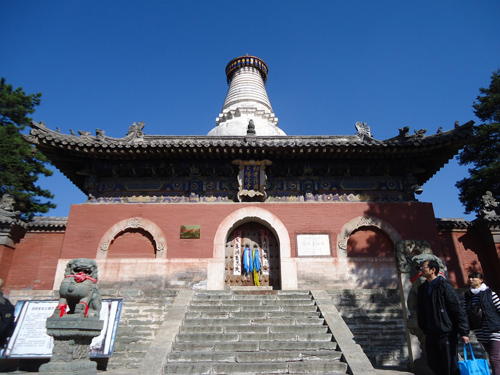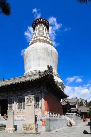 塔全稱為釋迦牟尼舍利塔,俗稱大白塔。塔身撥地而起凌空高聳,在五臺山群寺簇?fù)碇骂H為壯觀,人們把它做為五臺山的標(biāo)志。此塔通高七十五點三米,環(huán)周八十三點三米。塔基為正方形,塔身狀如藻瓶,粗細(xì)相間,方圓搭配,造型優(yōu)美。塔頂蓋銅板八塊成圓形,按乾、坎、艮、震、巽、離、坤、兌等八卦地位安置。塔頂中裝銅頂一枚,高約五米,覆盤二十一米多,飾有垂檐三十六塊,長兩米多;每塊垂檐底端掛風(fēng)鐘三個,連同塔腰風(fēng)鐘在內(nèi),全塔共有二百五十二個。風(fēng)歡鈴動,叮鐺作響。
