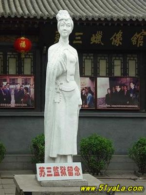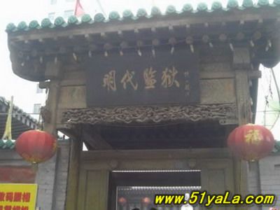 “蘇三監(jiān)獄”在今洪洞縣政府院內(nèi)西南,亦即明洪洞縣衙西南角。一進(jìn)掛有“明代監(jiān)獄”匾額的大門,首先看到的便是蘇三的塑像,外院當(dāng)年監(jiān)獄的辦公場(chǎng)所,右邊的院落是普通監(jiān)牢,中間是過(guò)道,兩邊共有監(jiān)牢十余間,過(guò)道頂上布有鐵絲網(wǎng),網(wǎng)上掛有銅鈴,一有犯人企圖越墻逃跑,便會(huì)觸響銅鈴。過(guò)道的盡頭,正對(duì)的是獄卒的值班室,右面的墻上有獄神的供位,傳說(shuō)當(dāng)年囚犯入獄都要參拜獄神,就是獄神下面的墻基處,有一小洞,是當(dāng)年運(yùn)送尸體的出口,犯人在獄中病死或是被打死,是不能從大門抬出去的,只能從這個(gè)小洞拉出去。過(guò)道盡頭的左邊,便是死囚牢的大門,死囚牢雙門雙墻,門上畫有狴犴,狴犴是龍的兒子,長(zhǎng)得卻象老虎,因此人們誤稱為“虎頭牢”,大約是因?yàn)辇埳抛?,子子不同,狴犴專門掌管刑獄,大門只有一米六高,所有進(jìn)入死囚牢的人都要在狴犴像前低頭,顯示對(duì)法律的敬畏。進(jìn)了門洞,里面還有一道門,而這兩道門卻是一扇從右開(kāi),一扇從左開(kāi),不明就里的囚犯如果越獄,往往出了第一道門卻怎么也打不開(kāi)第二道門,一個(gè)小小的改動(dòng)就能起到拖延犯人越獄時(shí)間的作用,不能不佩服古人的智慧。進(jìn)入死牢院,右面是一堵高墻,左面就是當(dāng)年關(guān)押蘇三的牢房,里面有蘇三的塑像。死囚院的中央還有當(dāng)年蘇三坐監(jiān)時(shí)洗衣的水井和石槽,井口留有一道道繩索磨下的印記,井口只有半尺多寬,這是為了防止死囚投井自殺。據(jù)說(shuō),右面的高墻里灌裝的都是流沙,如果犯人想要挖墻越獄,流沙便會(huì)從挖開(kāi)的小口中源源不斷地流來(lái),使其難以挖通圍墻。1964年我國(guó)著名考古學(xué)家王冶秋先生曾在洪洞考察確認(rèn),蘇三監(jiān)獄為我國(guó)罕見(jiàn)的明代監(jiān)獄,并題詩(shī)曰:“虎頭牢里羈紅妝,一曲攪亂臭水漿。王三公子今何在?此處空留丈八墻。”十年動(dòng)亂期間,蘇三監(jiān)獄被拆毀。為了使“蘇三監(jiān)獄”這一僅存的明代監(jiān)獄得以保留,洪洞縣人民政府后做出了修復(fù)“明代蘇三監(jiān)獄”的決定。修復(fù)事宜于1984年5月開(kāi)始,同年10月竣工。