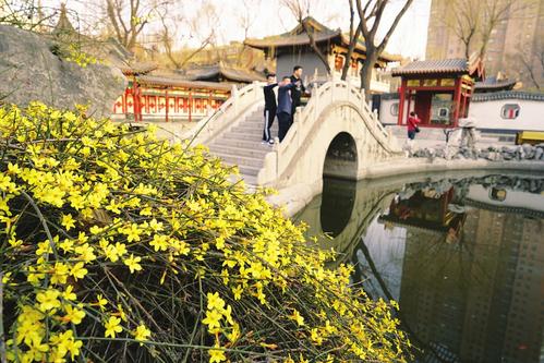 3月13日,玉蘭花、迎春花盛開在太原碑林公園,鮮艷的花朵與古香古色的碑亭相映成趣,游人漫步在花香之中,擁抱春天。本報(bào)記者 孫榮祥攝