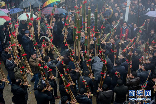 1月14日,人們?cè)趶V西融水苗族自治縣紅水鄉(xiāng)舉行的蘆笙節(jié)上賽蘆笙。