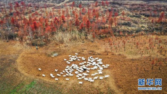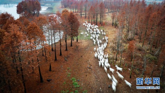 11月27日,牧歸的羊群行走在紅杉林中(無(wú)人機(jī)拍攝)。