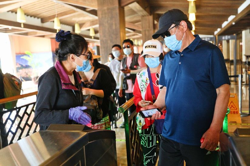 游客嚴(yán)格執(zhí)行疫情防控制度進(jìn)行核驗后進(jìn)入景區(qū)。