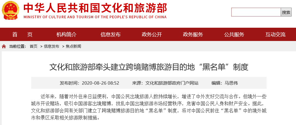 新華網(wǎng)北京8月26日電(記者 薛楓)據(jù)文化和旅游部網(wǎng)站消息,近年來,隨著對外往來日益便利,中國公民出境旅游人數(shù)持續(xù)增長,增進了中外友好交流與合作。但境外一些城市開設賭場,吸引中國游客出境賭博,擾亂中國出境旅游市場經(jīng)營秩序,危害中國公民人身和財產(chǎn)安全。據(jù)此,文化和旅游部會同有關(guān)部門建立了跨境賭博旅游目的地“黑名單”制度,將對中國公民前往“黑名單”中的境外城市和景區(qū)采取相關(guān)旅游限制措施。