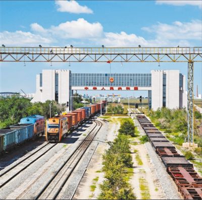 圖為日前,一列中歐班列經(jīng)二連浩特國門駛?cè)胛覈硟?nèi)。 本報記者 張 棖攝
