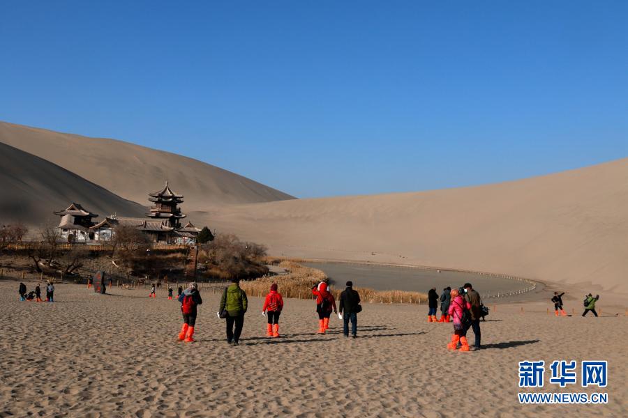 12月1日,游客在甘肅省敦煌市鳴沙山月牙泉景區(qū)游覽。