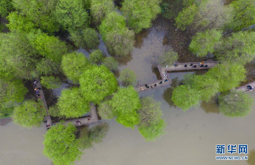 4月15日,在杭州市臨安區(qū)青山湖國家森林公園,游客行走在水上森林的棧道上(無人機照片)。