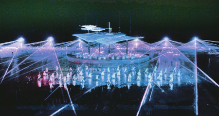 在這場演出中,最令人驚嘆的當數(shù)傳統(tǒng)文化與現(xiàn)代科技的完美融合。《如夢晉陽》演出設備島造型由大量不銹鋼鋼管經過設計、再加工拼接而成,整體形成“山”的造型,好似坐落于湖中心的小島。面積高達182米×82米的全水下噴泉矩陣、2000多束璀璨燈光,配合前方的直流、對拱、扇形水幕,連同后方80米×19米網幕形成的視覺矩陣投影,展現(xiàn)出宏大的山景古城畫面。這些畫面栩栩如生,將晉陽古城的歷史變遷、文化傳承一一展現(xiàn)在觀眾眼前,讓人仿佛置身于歷史的長河之中,親身感受著晉陽的興衰榮辱。