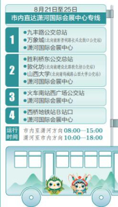 太原市將在山西文博會(huì)期間開通5條免費(fèi)公交接駁專線。其中,4條市內(nèi)直達(dá)瀟河國(guó)際會(huì)展中心的專線,分別從九豐路公交總站—萬象城(北向南新晉祠路長(zhǎng)興北街口公交站)—瀟河國(guó)際會(huì)展中心;勝利橋東公交總站—敦化坊(北向南建設(shè)北路敦化坊公交站)—山西大學(xué)(北向南塢城路山西大學(xué)公交站)—瀟河國(guó)際會(huì)展中心;火車南站西廣場(chǎng)公交站—瀟河國(guó)際會(huì)展中心;西橋地鐵站B站口—瀟河國(guó)際會(huì)展中心。運(yùn)行時(shí)間為市內(nèi)至瀟河方向8:00—15:00,瀟河至市內(nèi)方向10:00—18:00。此外,為便于駕車自行前往的市民出行,還開通了1條社會(huì)停車場(chǎng)至山西瀟河國(guó)際會(huì)展中心的免費(fèi)接駁線路。該線路從先行路瀟河大街口經(jīng)先行路至?xí)怪行耐颠\(yùn)行,在智慧南街口、先行路樂商街口??浚\(yùn)行時(shí)間為9:00—18:00。
