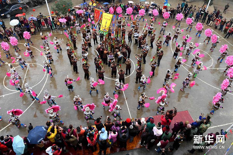 2月7日,廣西融水苗族自治縣安太鄉(xiāng)苗族群眾開展傳統的“打同年”民俗活動。當地數百名苗族同胞與游客們歡聚一堂,一起開展對歌、蘆笙踩堂、文藝晚會等活動,歡慶新春佳節(jié)。 “打同年”是融水苗族村寨的一種民俗,即友好村寨之間的拜年聯歡活動。新華社記者 李斌 攝