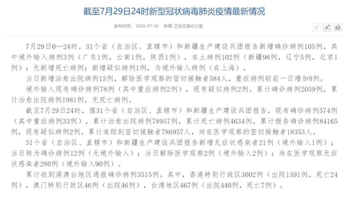 人民網(wǎng)北京7月30日電(董童)國(guó)家衛(wèi)生健康委于今日在官網(wǎng)發(fā)布的《截至7月29日24時(shí)新型冠狀病毒肺炎疫情最新情況》(以下簡(jiǎn)稱“情況”)提出,7月29日0—24時(shí),31個(gè)?。ㄗ灾螀^(qū)、直轄市)和新疆生產(chǎn)建設(shè)兵團(tuán)報(bào)告新增確診病例105例,其中境外輸入病例3例(廣東1例,云南1例,陜西1例),本土病例102例(新疆96例,遼寧5例,北京1例);無(wú)新增死亡病例;新增疑似病例1例,為境外輸入病例(在上海)。當(dāng)日新增治愈出院病例13例,解除醫(yī)學(xué)觀察的密切接觸者584人,重癥病例較前一日增加8例。