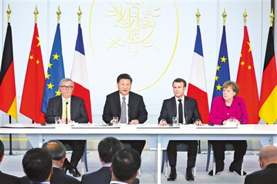 | 3月26日,國家主席習(xí)近平在巴黎同法國總統(tǒng)馬克龍一道出席中法全球治理論壇閉幕式。德國總理默克爾、歐盟委員會(huì)主席容克應(yīng)邀出席。 新華社記者 鞠 鵬攝 |
