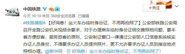 人民網(wǎng)北京5月8日電 據(jù)中國(guó)鐵路總公司官方微博消息,公安部鐵路公安局召開全路公安機(jī)關(guān)視頻會(huì)要求,對(duì)于辦理乘車臨時(shí)身份證明交費(fèi)照相問(wèn)題,要本著方便旅客、服務(wù)旅客的原則,公安制證窗口一律通過(guò)公安部人口信息系統(tǒng)核實(shí)辦證人員身份,不得要求辦證人員提供照片,更不允許要求辦證人員到指定地點(diǎn)照相辦理。