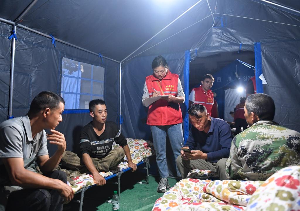 記者3日晚間在日地村18公里外的郎鼓村安置點(diǎn)看到,經(jīng)過(guò)緊急搶通電源,16頂應(yīng)急救災(zāi)帳篷里已接通了明亮的電燈。折疊床上鋪著整齊的被褥,一些老人在床頭盤(pán)腿而坐,當(dāng)?shù)馗刹亢椭驹刚咴谟行蜷_(kāi)展各種服務(wù)。