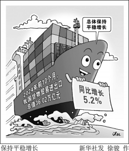 據(jù)新華社電 海關(guān)總署7日發(fā)布數(shù)據(jù)顯示,2024年前10個(gè)月,我國(guó)貨物貿(mào)易進(jìn)出口總值36.02萬(wàn)億元,同比增長(zhǎng)5.2%,總體保持平穩(wěn)增長(zhǎng)。