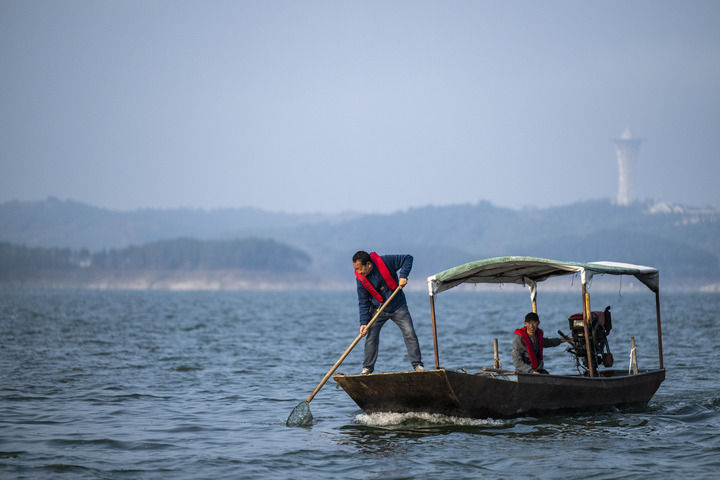 湖北丹江口市清漂隊(duì)隊(duì)長(zhǎng)楊力(左)和清漂隊(duì)隊(duì)員在丹江口水庫進(jìn)行清漂作業(yè)(2024年10月28日攝)。新華社記者 伍志尊 攝