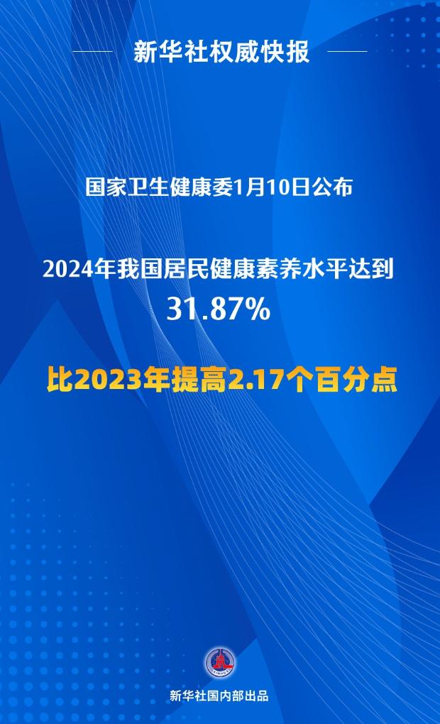 記者1月10日從國家衛(wèi)生健康委了解到,2024年我國居民健康素養(yǎng)水平達到31.87%,比2023年提高2.17個百分點。