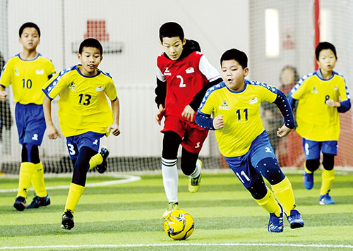11月18日,2018年新疆維吾爾自治區(qū)首屆體育產業(yè)杯青少年足球聯(lián)賽在新疆國際會展中心圣丹亞體育運動球場鳴哨開賽。此次足球聯(lián)賽邀請了來自烏魯木齊市、新疆昌吉回族自治州部分中小學及俱樂部共14支代表隊參加。圖為新疆農大附中代表隊球員(前)與昌吉足協(xié)代表隊球員在U12比賽中。據(jù)新華社 記者 王菲 攝