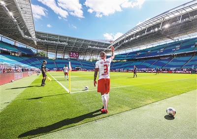 5月16日,德甲萊比錫隊(duì)球員安杰利諾準(zhǔn)備主罰角球。新華社發(fā)