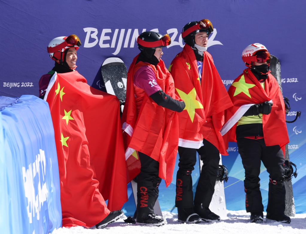 四面五星紅旗分別披在四位選手身上,他們享受著來自場(chǎng)內(nèi)四面八方的歡呼。他們的名字是紀(jì)立家、王鵬耀、朱永鋼、張義琦,他們是北京冬殘奧會(huì)殘奧單板滑雪男子障礙追逐UL級(jí)比賽大決賽的全部四名參賽選手,冠亞季殿軍獲得者。