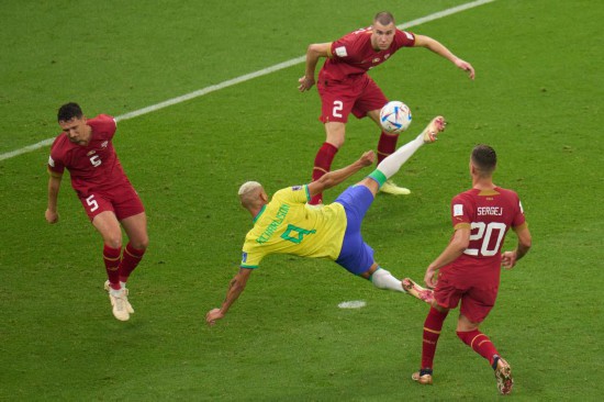 在首輪最后一場(chǎng)較量中,G組的巴西隊(duì)與塞爾維亞隊(duì)在上半場(chǎng)沒(méi)能進(jìn)球。易邊再戰(zhàn),巴西隊(duì)的理查利森接管了比賽,他先是在第62分鐘補(bǔ)射入網(wǎng),又在第73分鐘憑借個(gè)人能力完成一記精彩的轉(zhuǎn)身倒鉤破門,為球隊(duì)鎖定勝局。