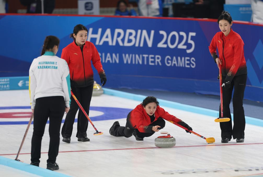 2月10日,中國隊(duì)選手蘇亭毓(右二)在比賽中擲壺。新華社記者 胡星宇 攝
