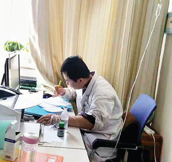 3月10日起,在微信朋友圈里,這張醫(yī)生掛吊瓶接診的照片引起了很多人的關注。照片中一名身穿白大褂的醫(yī)生正在值班室埋頭寫病歷,他的一只手上正輸著液體。筆者了解到,是一名病人的家屬上傳了這張照片。他的父親十幾天前曾在中醫(yī)院9樓心血管病房住院,在父親住院的一天,他去值班室詢問父親病情時,看到了徐強醫(yī)生打吊瓶堅持工作,這讓他十分感動,于是就悄悄用手機拍了照并上傳至微信朋友圈。