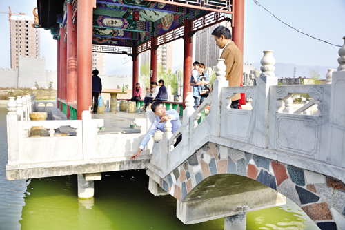 這個(gè)時(shí)候,宋利峰和女友劉丹,帶著姐姐的孩子也恰好走進(jìn)水榭。孩子們?cè)谂d趣方面往往會(huì)有驚人的趨同感,宋利峰的小外甥“眼饞”月月手里的魚食,在韓建萍的開導(dǎo)下月月從袋子里抓了一把魚食給了這個(gè)陌生的小伙伴。月月仍在水榭西側(cè)的欄桿處向水面撒食,宋利峰的小外甥在石拱橋上模仿月月的動(dòng)作,兩個(gè)孩子之間的斜線距離不足一米。