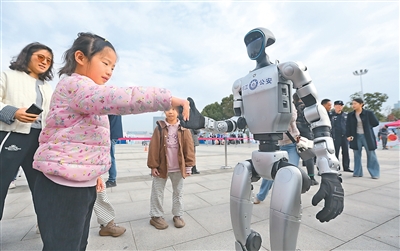 10月25日,江蘇省揚州市公安局在揚州市明月湖廣場舉行警營開放日活動,現場設立多個主題互動展區(qū),市民可以近距離接觸警務裝備。圖為人形機器人與小朋友互動。孟德龍攝(人民視覺)