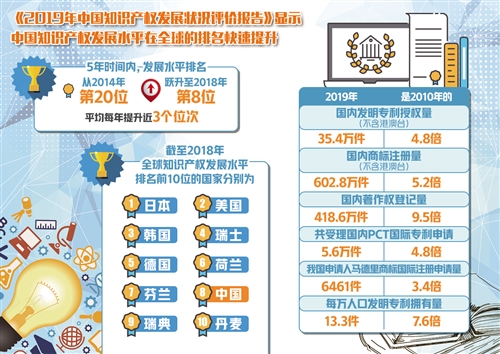 9月14日,中國國家知識產(chǎn)權局知識產(chǎn)權發(fā)展研究中心發(fā)布的《2019年中國知識產(chǎn)權發(fā)展狀況評價報告》顯示,中國知識產(chǎn)權發(fā)展水平在全球的排名快速提升,短短5年時間內(nèi),排名已從2014年的第20位,快速躍升至2018年的第8位,平均每年提升近3個位次。