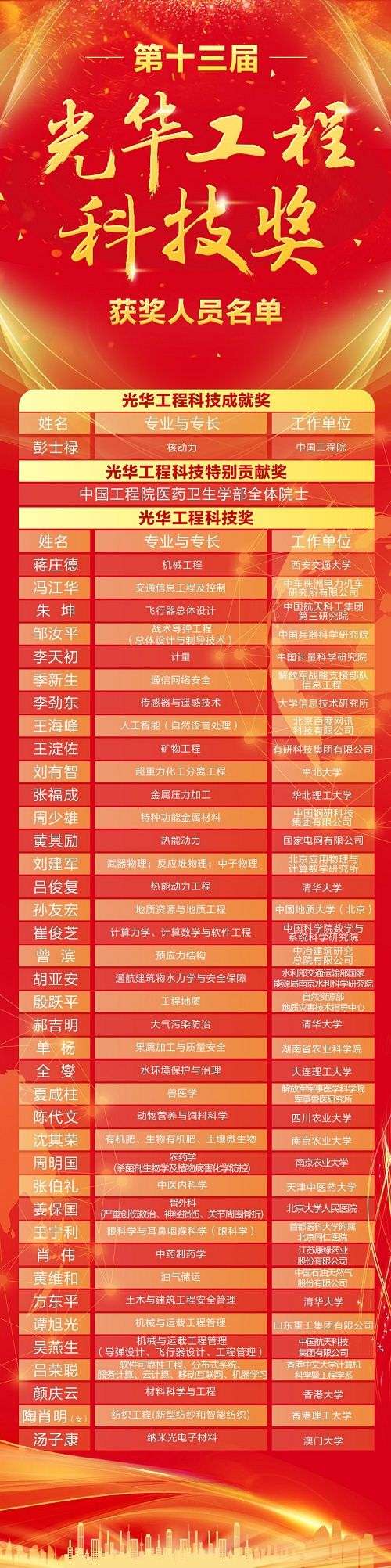 此外,還有機(jī)械工程專家蔣莊德、計(jì)量專家李天初、人工智能專家王海峰、特種功能金屬材料專家周少雄等不同學(xué)科領(lǐng)域的39位專家獲得光華工程科技獎,這些專家均以非凡的積極性和創(chuàng)造性,在各自領(lǐng)域取得了傲人成績,為我國工程科學(xué)技術(shù)事業(yè)的發(fā)展做出了巨大貢獻(xiàn)。