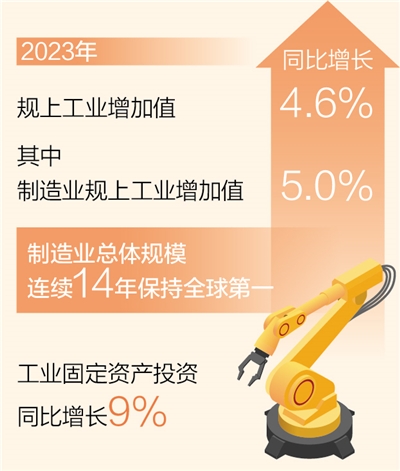 記者日前從工業(yè)和信息化部獲悉:2023年,全年規(guī)模以上工業(yè)增加值同比增長(zhǎng)4.6%,較2022年提升1個(gè)百分點(diǎn),其中制造業(yè)規(guī)模以上工業(yè)增加值同比增長(zhǎng)5.0%,我國制造業(yè)總體規(guī)模連續(xù)14年保持全球第一。