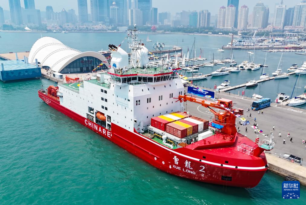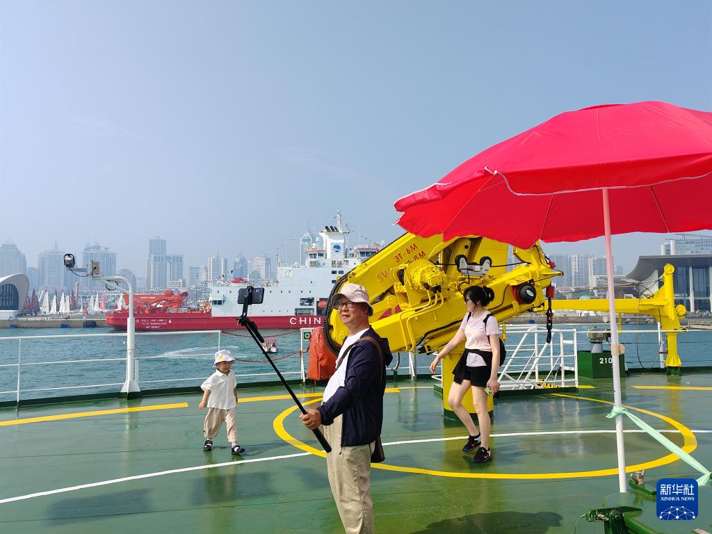 7月3日,“雪龍2”號極地科考破冰船靠泊在青島奧帆中心碼頭(無人機照片)。新華社發(fā)(張進剛攝) 作為我國第一艘自主建造的極地科考破冰船,“雪龍2”號于2019年首次參與中國極地考察,并在今年4月順利完成我國第40次南極考察任務(wù)??瓶颊鞒躺希票?,穿越過南半球的“咆哮西風(fēng)帶”,也抵達過地球極北,一次次滿載成果凱旋。 “能看到極夜嗎?”“船上的垃圾怎么處理?”“一次科考要去多少人?有哪些項目?”……登船的觀眾對于極地探索充滿了好奇與向往,接連向工作人員發(fā)問。 “‘雪龍2’號船身龐大、設(shè)備很新、儀器精密。”這是觀眾劉巖對“雪龍2”號的第一印象。 “雪龍2”號總長122.5米,排水量近1.4萬噸,定員101人,是全球第一艘采用船艏、船艉雙向破冰技術(shù)的極地科考破冰船,雙向破冰均有以2至3節(jié)船速連續(xù)破1.5米冰加0.2米積雪的能力。船內(nèi)還配備了科考絞車、深海淺地層剖面儀、海底地震儀等設(shè)備,能滿足海底精細化測量和漁業(yè)資源探測等作業(yè)需求。