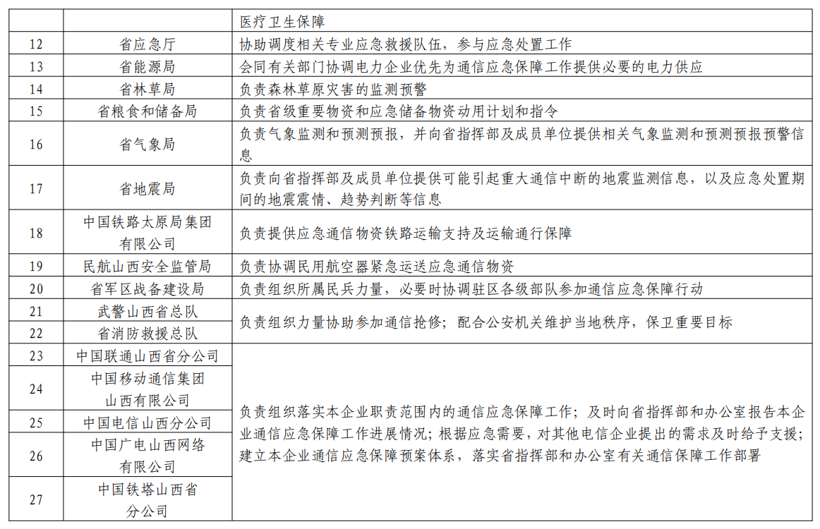成員:省通信管理局、省委宣傳部、省委網(wǎng)信辦、省發(fā)展改革委、省公安廳、省財政廳、省自然資源廳、省交通廳、省水利廳、省衛(wèi)健委、省應(yīng)急廳、省能源局、省林草局、省糧食和儲備局、省氣象局、省地震局、中國鐵路太原局集團有限公司、民航山西安全監(jiān)管局、省軍區(qū)戰(zhàn)備建設(shè)局、武警山西省總隊、省消防救援總隊以及省基礎(chǔ)電信企業(yè)等部門單位相關(guān)負責人。