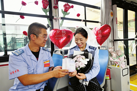 另一對公交夫妻是今年同為39歲的焦更新和李靈,均是812路公交車駕駛員,他們倆是初中同學(xué),當(dāng)天還是他們結(jié)婚第17年的紀(jì)念日。一大早,焦更新就來到車隊,布置車廂,等著妻子的到來?!袄掀牛Y(jié)婚紀(jì)念日快樂!也祝你七夕快樂!”李靈看著鮮花和禮物很是驚訝,走到布置好的車廂后,更是紅了臉。“真沒想到今年的結(jié)婚紀(jì)念日能收到這么大的驚喜,鮮花、浪漫的車廂,還有化妝品,很開心很感動,感謝老公的這份愛意。在工作中,我會把這份愛意傳遞給更多的乘客?!庇兄?2年駕齡的李靈,是一名五星級駕駛員,她在提升駕駛技術(shù)和服務(wù)等方面很是鉆研,工作中還有自己的很多創(chuàng)新,在車廂布置“便民袋”,放上地圖、問候乘客的手繪海報等,細(xì)微的服務(wù)打動了很多乘客,她把車廂當(dāng)成自己的家一樣呵護。