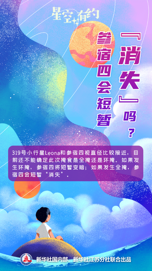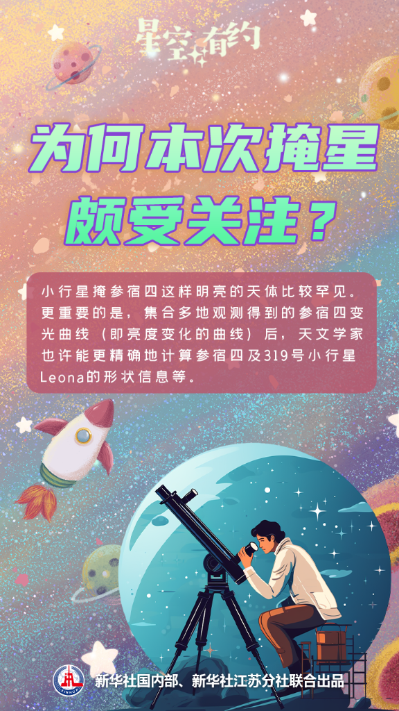 太陽系的行星、小行星等在移動時,時常會掩住遠(yuǎn)處的恒星。不過,小行星掩參宿四這樣明亮的天體比較罕見?!皯{肉眼看到參宿四明顯變暗或‘消失’,將會是一次難得的體驗?!蓖蹩瞥榻B說,此次掩星不僅有觀賞性,還具有科學(xué)價值。集合多地觀測得到的參宿四變光曲線(即亮度變化的曲線)后,天文學(xué)家也許能更精確地計算參宿四及319號小行星Leona的形狀信息等。