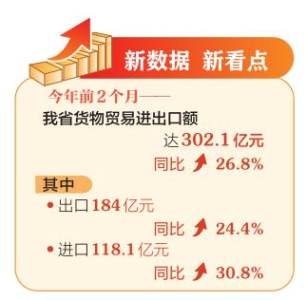 在去年同期低基數(shù)、重點(diǎn)企業(yè)延續(xù)增長態(tài)勢、多個(gè)重點(diǎn)商品大幅增長的疊加影響下,今年前2個(gè)月全省外貿(mào)實(shí)現(xiàn)大幅增長,新增長點(diǎn)不斷涌現(xiàn)。出口商品中,手機(jī)及零件、軌道交通裝備和煤炭是拉動(dòng)出口增長的主要因素;進(jìn)口商品中,集成電路、各類金屬礦砂、煤炭是拉動(dòng)進(jìn)口增長的主要因素。