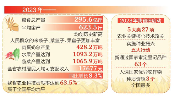 一分耕耘一分收獲。近年來,我省糧食和重要農產品生產穩(wěn)定、供給充足,農業(yè)農村現(xiàn)代化不斷邁出新步伐。2023年,糧食總產量295.6億斤,平均畝產623.5斤,均創(chuàng)歷史新高;人民群眾的米袋子、菜籃子、果盤子更加豐富,肉蛋奶總產量428.2萬噸,水果、蔬菜產量分別達到1093.2萬噸、1065.9萬噸;全省農村居民人均可支配收入17677元,同比增長8.3%。這些成績的取得,得益于科技賦能助力。2023年我省農業(yè)科技貢獻率達到63.5%,高于全國平均水平。
