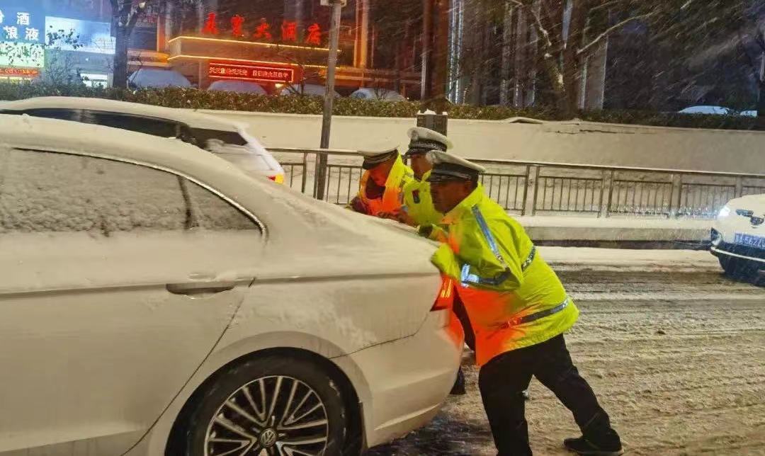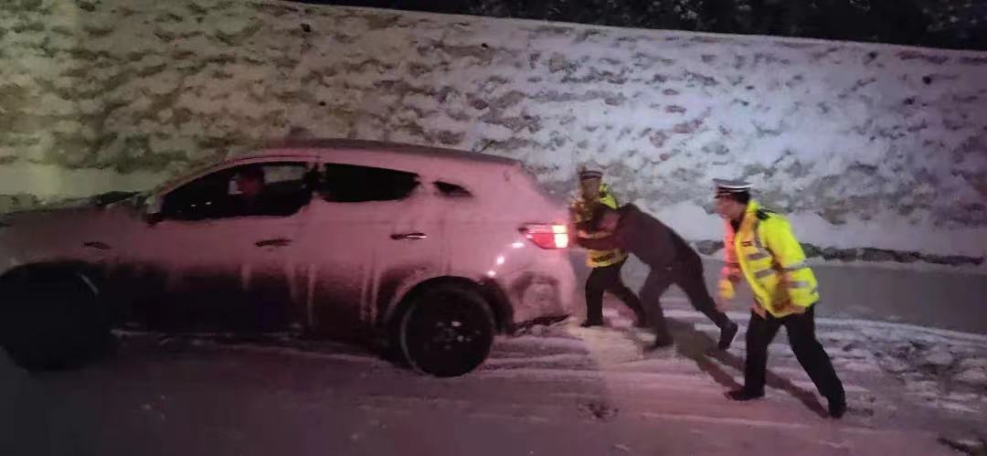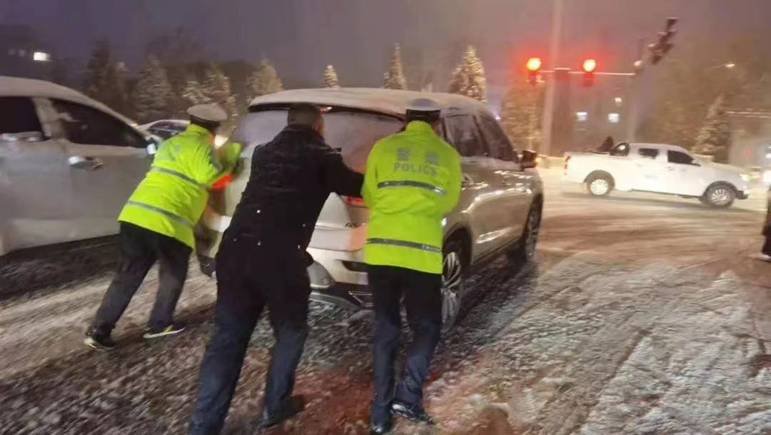 神池縣境內(nèi)夜間道路積雪較厚,澗口坡路段車輛打滑被困,安全股和龍泉中隊執(zhí)勤民輔警協(xié)助推車,全力保障人們出行平安