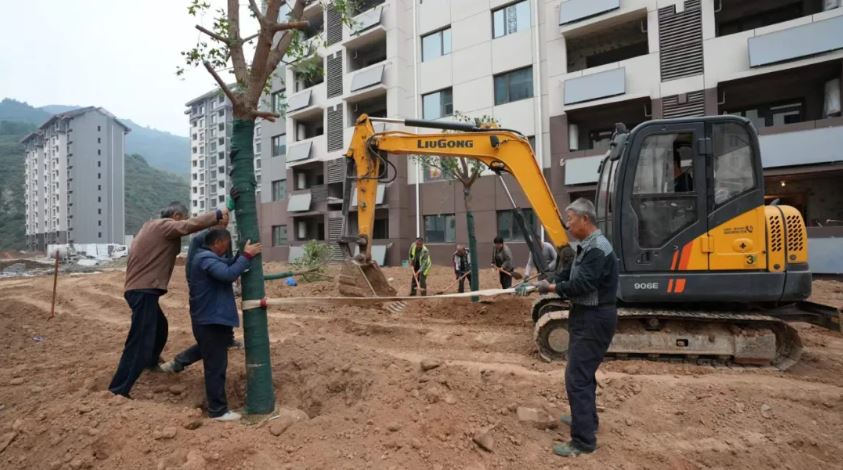 石咀鎮(zhèn)射虎川住宅安置區(qū)工人正進(jìn)行綠化種植作業(yè)