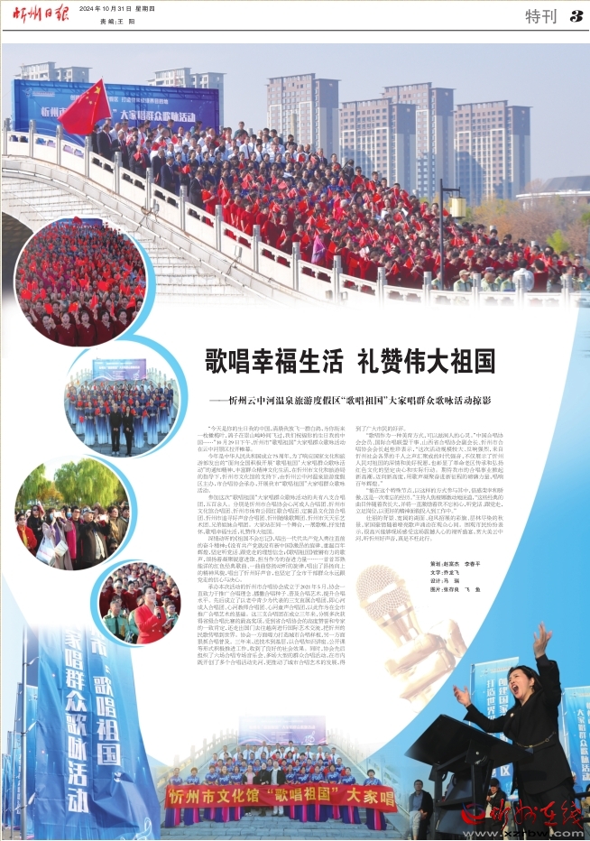 今年是中華人民共和國成立75周年,為了響應國家文化和旅游部發(fā)出的“面向全國積極開展‘歌唱祖國’大家唱群眾歌詠活動”的通知精神,豐富群眾精神文化生活,在忻州市文化和旅游局的指導下,忻州市文化館的支持下,由忻州云中河溫泉旅游度假區(qū)主辦,市合唱協(xié)會承辦,開展我市“歌唱祖國”大家唱群眾歌詠活動。