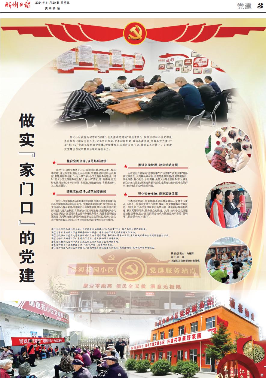 居民小區(qū)被稱為城市的“細胞”,也是基層黨建的“神經(jīng)末梢”。我市以推動小區(qū)黨群服務(wù)站規(guī)范化建設(shè)為切入點,優(yōu)化空間布局、完善功能配置,盤活各類資源、統(tǒng)籌各方力量,打造“家門口”黨建工作的有效載體,把便捷服務(wù)送到群眾家門口、做到居民心坎上。全面激發(fā)黨建引領(lǐng)城市基層治理的蓬勃活力。