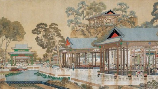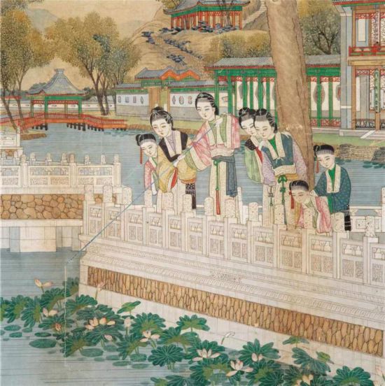 畫面中,曲折縈紆的溪水自蘅蕪院流經(jīng)牡丹亭、凹晶館、蓼風(fēng)軒、秋爽齋等地,最終蜿蜒向畫面遠(yuǎn)方,層層亭臺廊橋,一望無盡。許軍杰認(rèn)為,此繪之溪水應(yīng)為沁芳溪。正如周汝昌先生在《北京大觀園·引言》中評價:“大觀園全部的主脈與‘靈魂’是一條蜿若游龍的‘沁芳溪’。亭、橋、泉、閘,皆以此二字為名,可為明證。一切景觀,依溪為境”,“大觀園的一切池、臺、館、泉、石、林、塘,皆以沁芳溪為大脈絡(luò)而盤旋布置?!眻D中的這曲溪水亦有異曲同工之功能,將兩岸建筑、山石、樹木巧妙地聯(lián)系在一起,使其形成一個有機(jī)的園林整體。(李君娜)